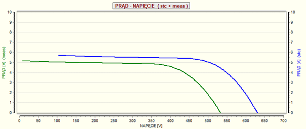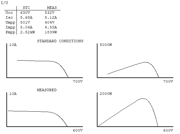 Pierwszym krokiem w testach kategorii 2 jest test charakterystyki prądowo-napięciowej stringu. Jest to rozszerzona wersja pomiarów Voc i Isc z kategorii 1 - oprócz wartości tych wartości (które w sposób naturalny z dwóch stron domykają krzywą I-V) wykreślenie całej charakterystyki pozwala uzyskać również informacje o napięciu punktu mocy maksymalnej Vmpp, prądzie punktu mocy maksymalnej Impp oraz maksymalnej mocy uzyskanej właśnie w tym punkcie Pmax (Pmpp). Dodatkowo przy równoległym zastosowaniu miernika irradiancji wykreślona charakterystyka I-V może być przeliczona do warunków STC (Standard Test Conditions) co w konsekwencji umożliwia realną ocenę efektywności pracy danej instalacji w stosunku do danych katalogowych producenta. Oprócz tego sam kształt charakterystyki pozwala zdiagnozować kilka podstawowych nieprawidłowości w pracy instalacji.
