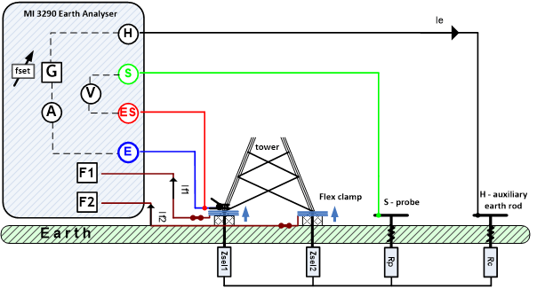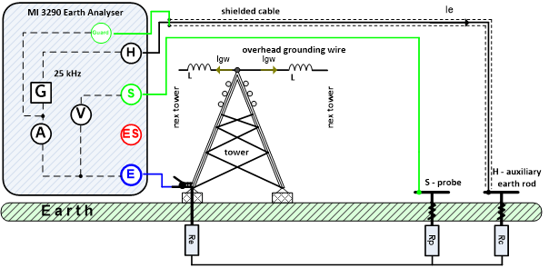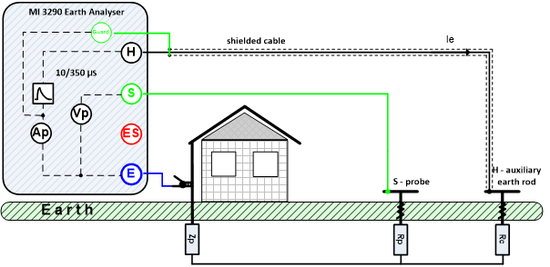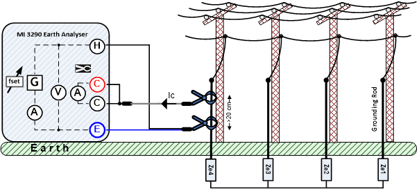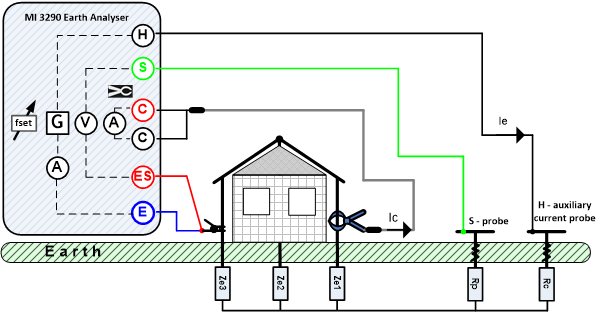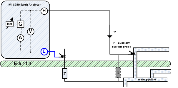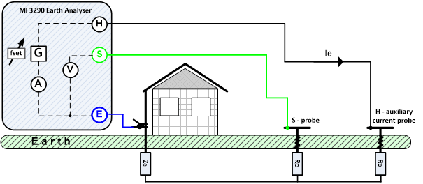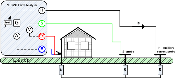Podczas pomiaru prąd sinusoidalny Ie wprowadzany jest do gruntu za pomocą sondy pomocniczej H. Impedancja sondy pomocniczej powinna być jak najniższa w celu wymuszenia odpowiednio wysokiego prądu. Impedancja Rc może zostać zmniejszona poprzez zastosowanie dodatkowych sond równolegle lub przez użycie uziomu naturalnego. Impedancja uziemienia Ze określana jest na podstawie stosunku napięcia i prądu. Z reguły impedancja Rc jest znacznie niższa niż Ze. W takim przypadku wynik może być uznany jako ~ Ze.