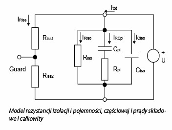 Zgodnie z prawem Ohma, I=U/R prąd nie zależy od czasu. Jednak proste pomiary izolacji pokazują, że w praktyce jest inaczej. Przyczyną takiego zachowania prądu są różne zjawiska w materiale izolacyjnym po przyłożeniu napięcia. Typowy schemat izolacji, prezentujemy poniżej.