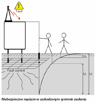 Poprawne podłączenie uziemienia do metalowych elementów obudowy, gwarantuje, że napięcia pojawiące się na ich powierzchni pozostaną poniżej niebezpiecznego poziomu w przypadku awarii. Jeśli nastąpi awaria, prąd uszkodzeniowy popłynie do elektrody uziemiającej.