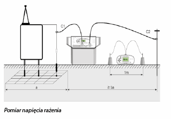 Pomiar napięcia krokowego wykonywany jest pomiędzy dwoma uziemionymi punktami, oddalonymi o 1 m. Sondy 25kg symulują stopy. Napięcie pomiędzy sondami, mierzone jest woltomierzem o wewnętrznej rezystancji równej 1kΩ co odpowiada rezystancji ciała.
