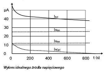 W praktyce pomiar rezystancji izolacji nie zawiera idealnego źródła napięciowego. Na początku cała dostępna moc przyrządu jest wykorzystywana do naładowania w krótkim okresie kondensatora Ciso. Napięcie na stykach w konsekwencji spada.
