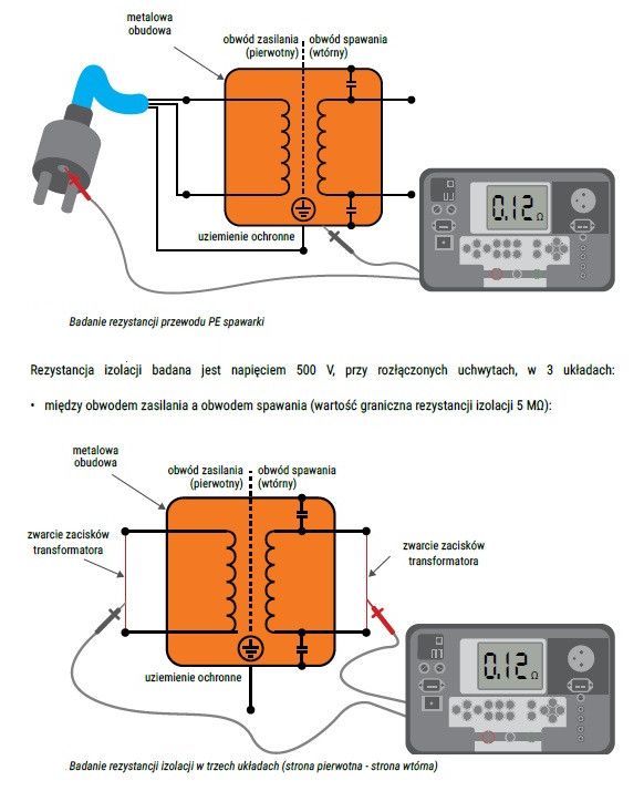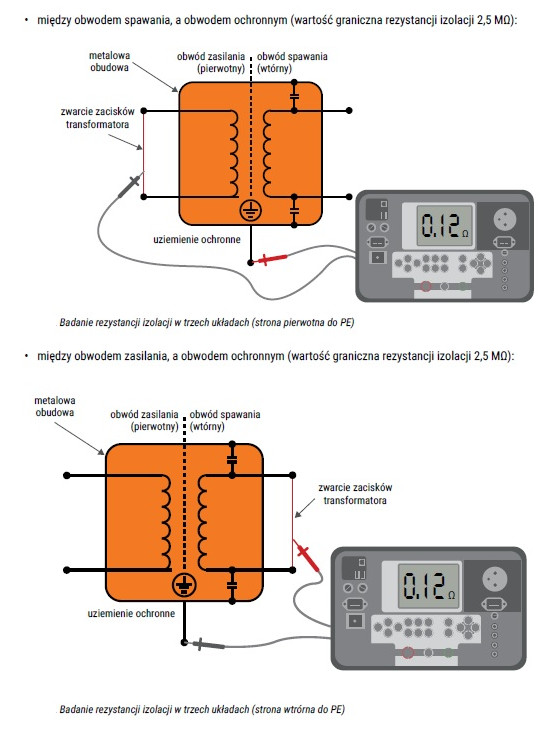 • między obwodem zasilania a obwodem spawania (wartość graniczna rezystancji izolacji 5 MΩ):