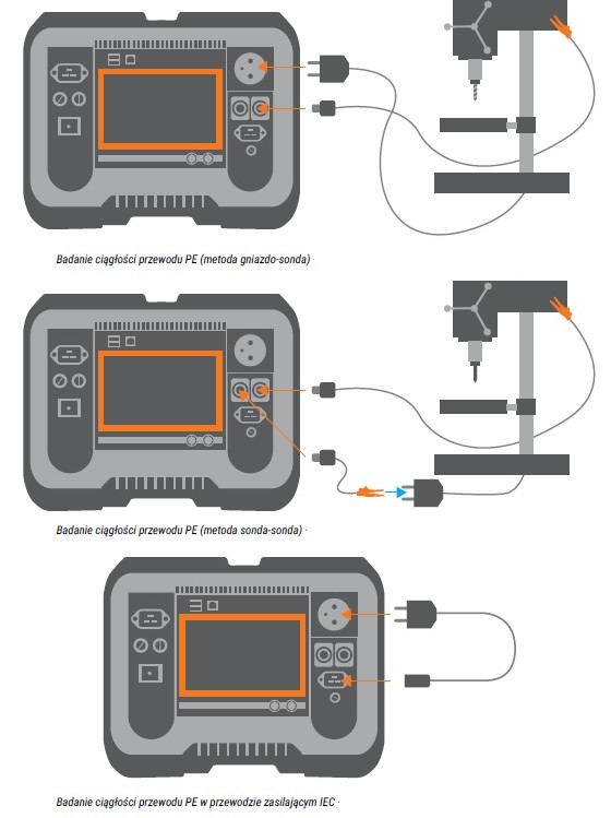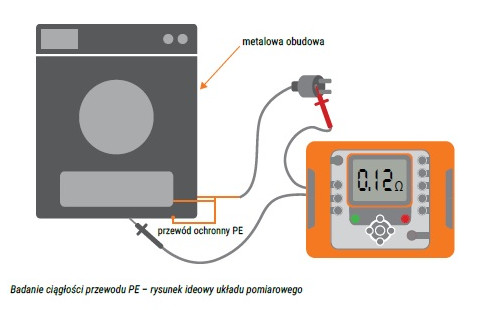 Ciągłość obwodu PE sprawdza się pomiędzy stykiem ochronnym wtyczki, a odsłoniętymi częściami metalowymi