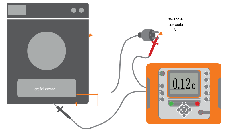 Badanie wykonuje się pomiędzy zwartymi przewodami L–N a dostępnymi, metalowymi częściami obudowy. Sprawdzać należy nie tylko główne elementy, ale także wszelkie śrubki, zaciski lub inne metalowe części. Zdarzyć się może, że po złożeniu np. uchwytu w elektronarzędziu śruba przetrze izolację przewodu czynnego i tym samym znajdzie się pod napięciem.