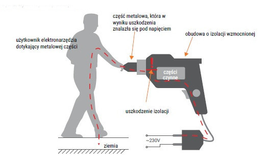 Przykład uszkodzenia izolacji w urządzeniu II klasy ochrony.