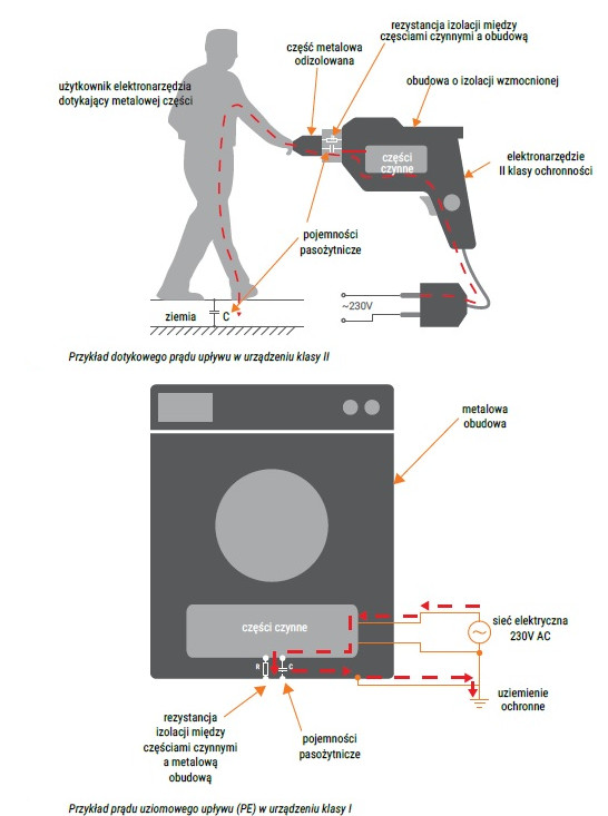 klasa I oprócz izolacji podstawowej, wszystkie dostępne części metalowe połączone są z przewodem ochronnym PE, w taki sposób, że w przypadku uszkodzenia izolacji podstawowej nie mogą znaleźć się pod napięciem,