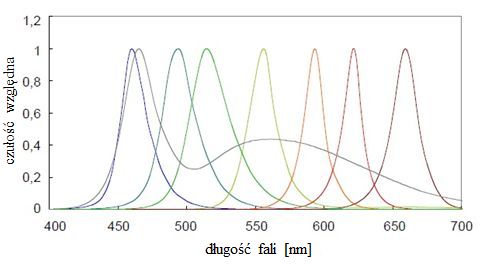 Rys. 1. Względne rozkłady widmowe mocy promienistej typowych diod LED