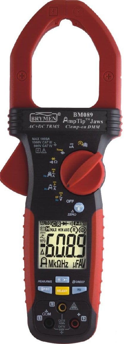 Brymen BM086 to miernik cęgowy do pomiaru prądu 1000A, posiadający unikalną funkcję AmpTip przeznaczoną do dokładnego pomiaru cęgowego małych prądów (do 60,00A) w przewodach o niewielkiej średnicy - cęgi wyposażone są w specjalne wcięcie w szczytowej części. Ponadto model BM089 pozwala na pomiar cęgowy prądu stałego oraz przemiennego za składową stałą. Oprócz pomiaru cęgowego miernik oferuje możliwość przewodowego pomiaru małych prądów na zakresach 200,0µA i 2000µA. Miernik zapewnia pomiar ACV w trybie VFD (z filtrem dolnoprzepustowym) i ACV+DC.