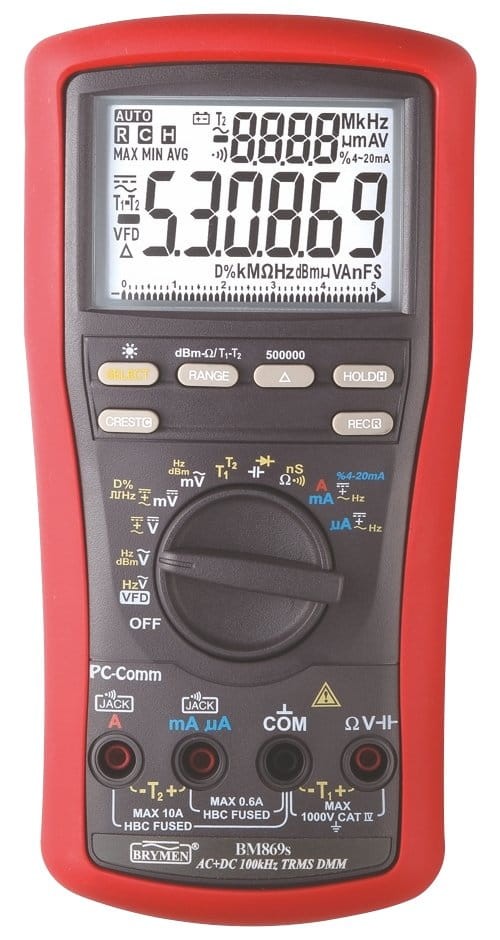 Multimetr Brymen BM869 oferuje mnogość funkcji, łącznie z pomiarem przewodności (nS), tłumienia (dBm), pętli prądowej (4~20mA), dwukanałowym pomiarem temperatury a podwójny wyświetlacz pozwala na jednoczesne wyświetlanie szeregu mierzonych wielkości.