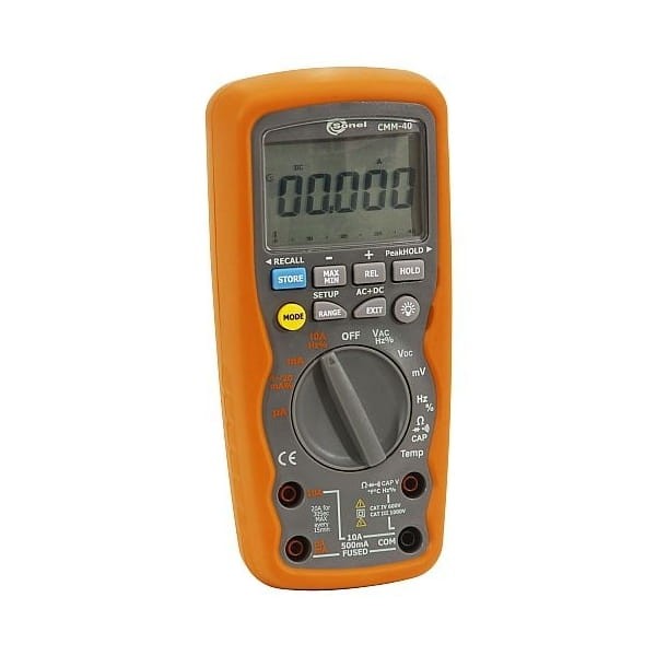 Sonel CMM-40 to multimetr przemysłowy, będący uniwersalnym przyrządem mierzącym napięcie oraz prąd (stałe i przemienne TRUE RMS), a dodatkowo pojemność, częstotliwość, cykl roboczy (wypełnienie), ciągłość połączeń, rezystancję, temperaturę. Miernik charakteryzuje się dużą odpornością na wpływ warunków atmosferycznych oraz czynników zewnętrznych (IP67).