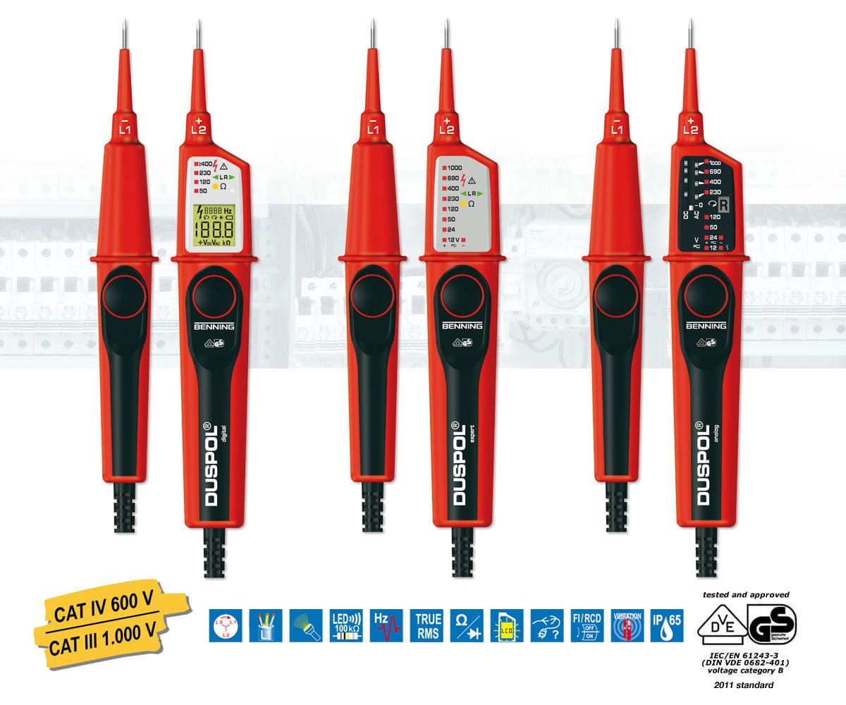 Generacja przyrządów probierczych napięć DUSPOL® jeszcze raz podkreśla doświadczenie firmy BENNING w dziedzinie technologii przyrządów probierczych, pomiarowych i zabezpieczających. Wraz z próbnikiem napięć DUSPOL® nabywacie Państwo nowatorski produkt, który został sprawdzony i zatwierdzony przez VDE i Instytut Certyfikacji.