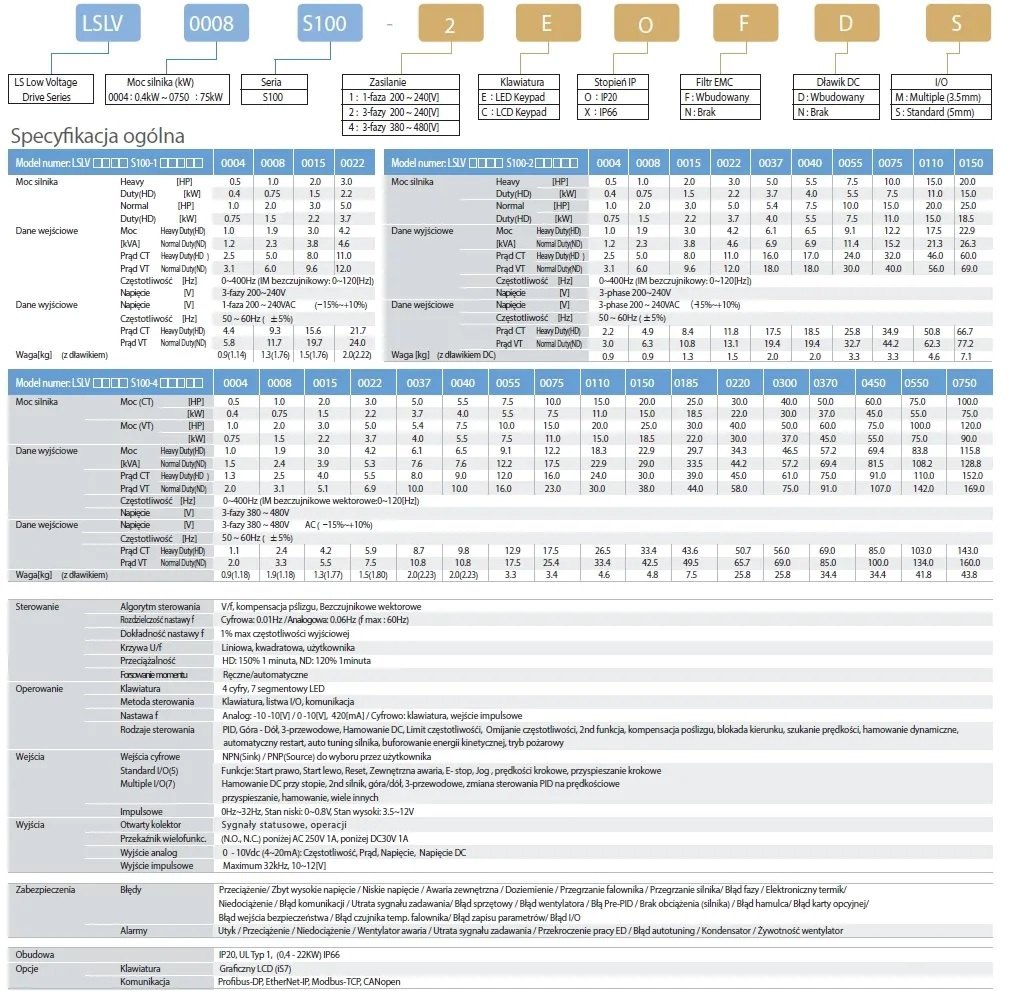Falownik LG S100 - LSLV0220S100-4EOFNM (P: 22kW, U: 3x400V, Iout: 45A)