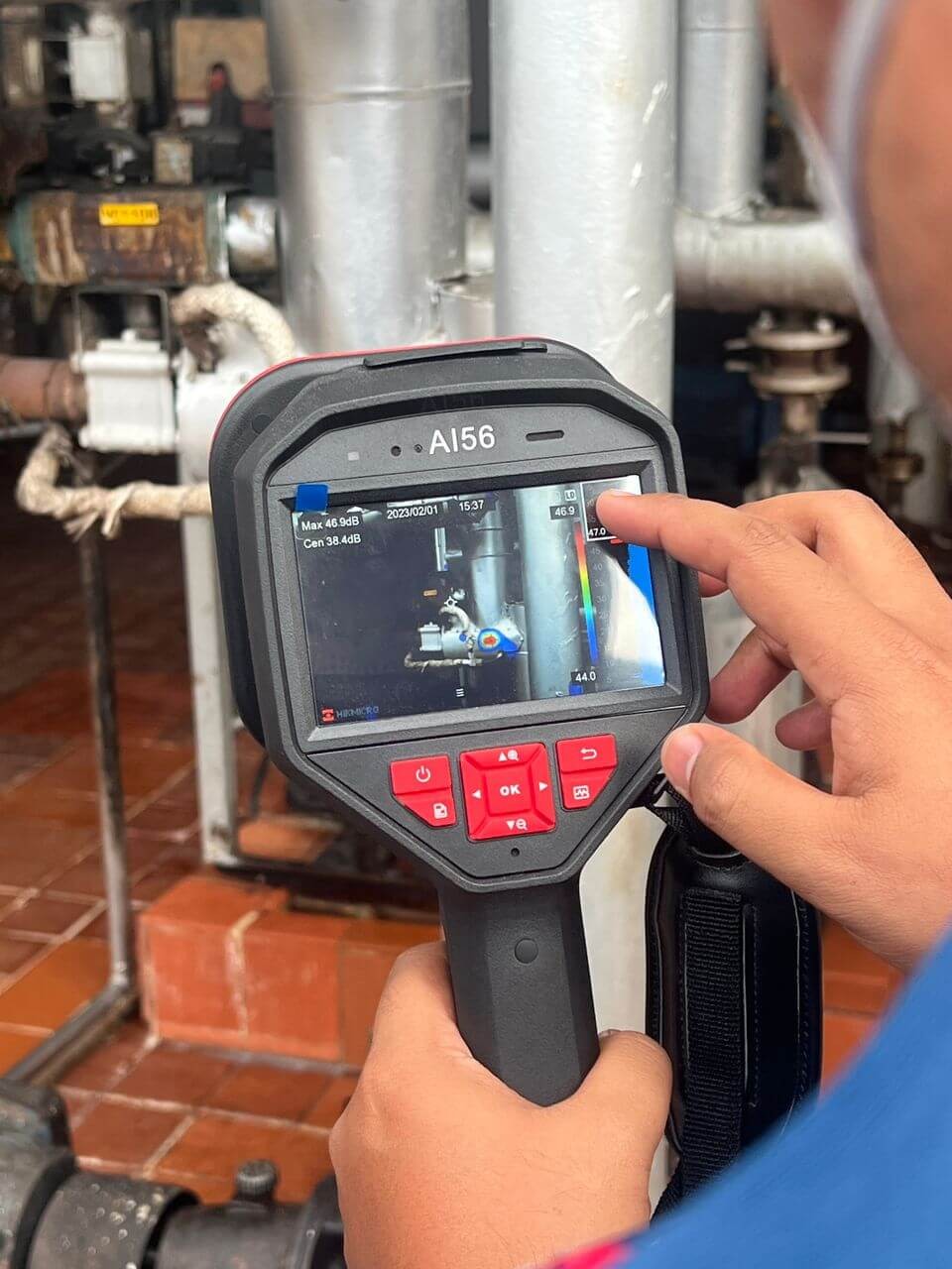 Kamera akustyczna Hikmicro AI56L to profesjonalne narzędzie do wykrywania nieszczelności w instalacjach sprężonego powietrza. Dzięki 64 mikrofonom MEMS z niskim szumem własnym oraz filtrom częstotliwościowym w zakresem od 2 kHz do 60 kHz, urządzenie efektywnie lokalizuje wycieków sprężonego powietrza w środowisku przemysłowym, nawet w przypadku wysokiego hałasu tła. Wyniki są czytelnie prezentowane na 4,3 calowym ekranie LCD. Maksymalna odległość wykonywania pomiaru może sięgać aż 150 metrów, dzięki czemu operator kamery AI56 może w łatwy sposób zlokalizować nieszczelności znajdujące się na dużej wysokości. Kamera pozwala na obliczenie kosztów związanych z wyciekiem oraz prognozy dotyczące okresowych kosztów danego uszkodzenia. Dzięki samodzielnemu wprowadzeniu informacji o sprężarkach, koszcie gazu i cenach energii dokładność estymacji zwiększa się umożliwiając wykorzystanie jej w długofalowych prognozach.