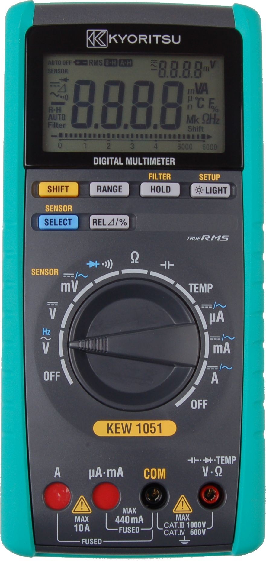 Uniwersalny multimetr cyfrowy Kyoritsu KEW1051 z podwójnym, podświetlanym wyświetlaczem LCD (6 000max + 6 000max) oraz bargrafem. Miernik umożliwia pomiar między innymi takich parametrów jak: napięcie DC / AC, natężenie prądu DC / AC, rezystancji, częstotliwości, pojemności i temperatury. Ponadto za jego pomocą można przeprowadzić test diody oraz sprawdzić ciągłość obwodu. Mnogość funkcji pomiarowych, wysoka dokładność bazowa (0.09%) oraz szybkie próbkowanie (5 razy / sekundę dla LCD i 25 razy / s dla bargrafu) sprawiają, że miernik Kyoritsu KEW 1051 zadowoli nawet najbardziej wymagających użytkowników.