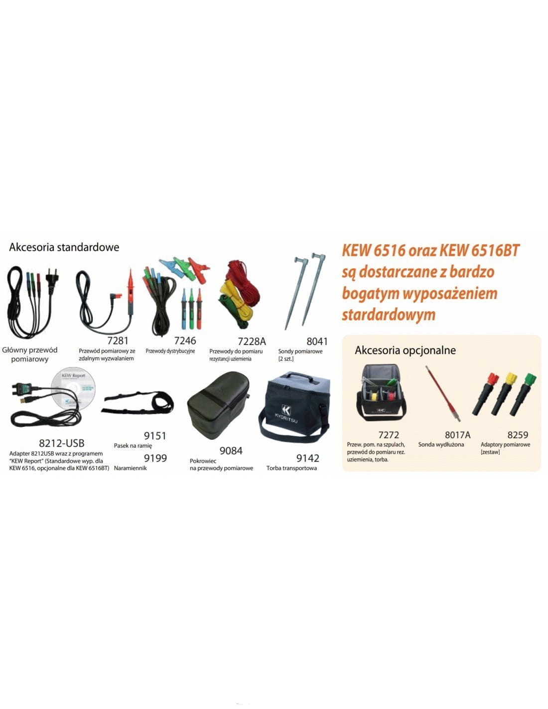 7218A przewód pom., 7281(przewód pom. ze zdalnym wyzwalaniem), 7246 (Przewody pom.), 7228A (Przewody pom. do rez, uziemień), 8041(Sondy pomiarowe - 2 szt), 9084 (Pokrowiec), 9142 (Pokrowiec), 9151 (Pasek na ramię), 9199 (Naramiennik), baterie LR6 (AA) 8szt., Instrukcja obsługi, certyfikat kalibracji, KEW Report (do pobrania ze strony producenta)