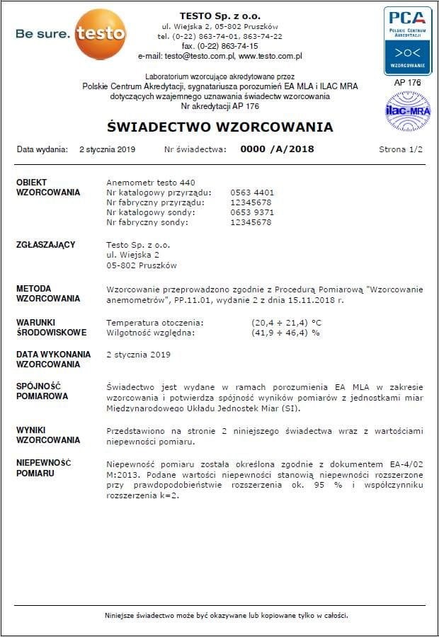 Akredytowane świadectwo wzorcowania anemometru - PCA